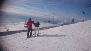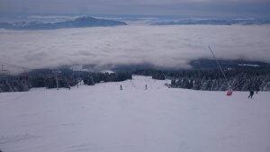 Było RE-WE-LA-CYJ-NIE! Mróz był spory, ale do przeżycia (do -11 stopni + wiatr), słońce pojawiało się i znikało, ale momentami całkiem przyjemnie grzało. Chmury były, ale i w nich często robiły się dziury pokazujące niebieskie niebo. Widoczność – na trasach bardzo dobra, na góry Choczańskie, Fatrę czy Tatry – cóż… nie tym razem 😉